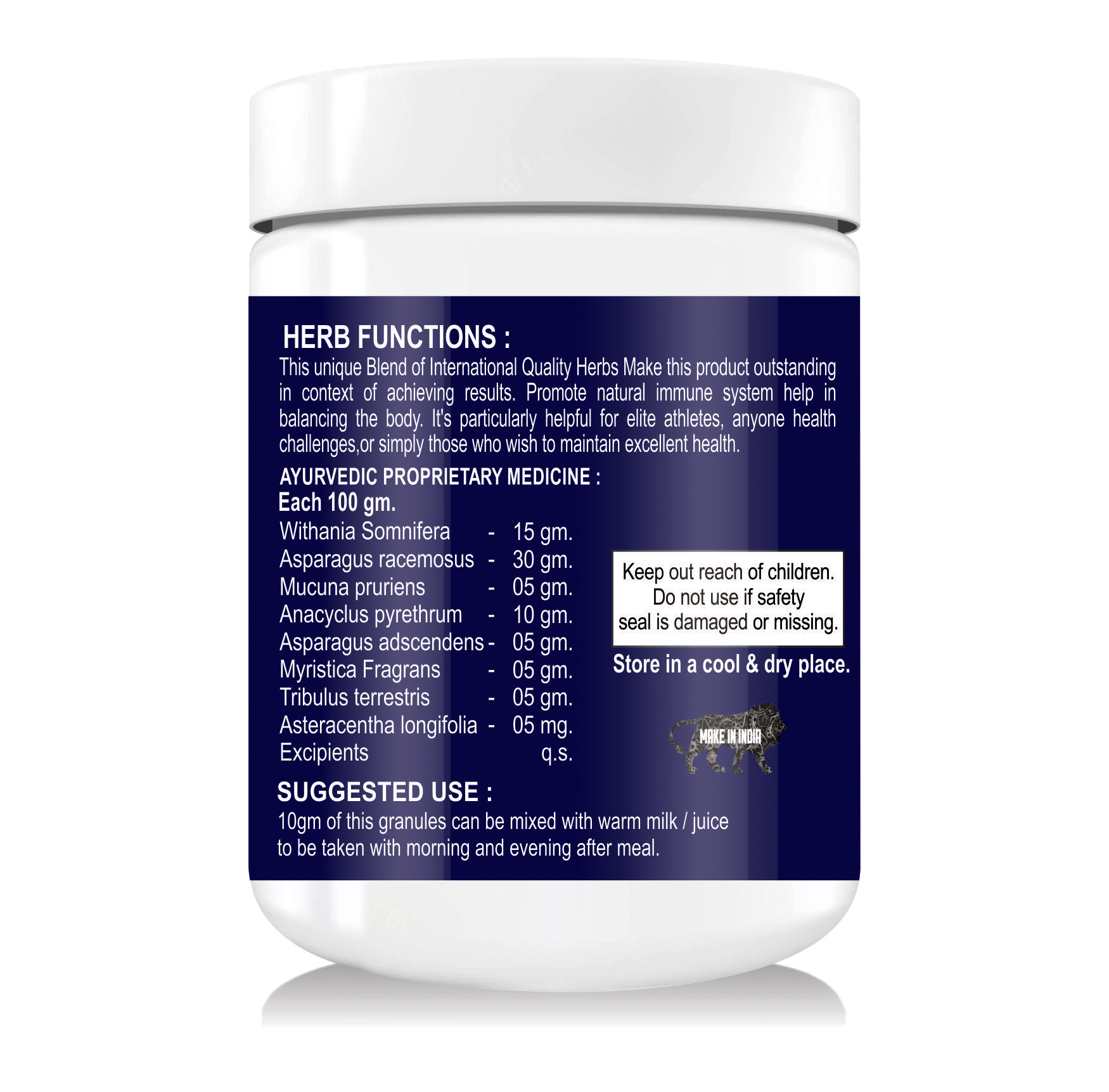 • Dosage: Take 1 table spoon powder and blend with warm water or milk or as Directed by the physician.